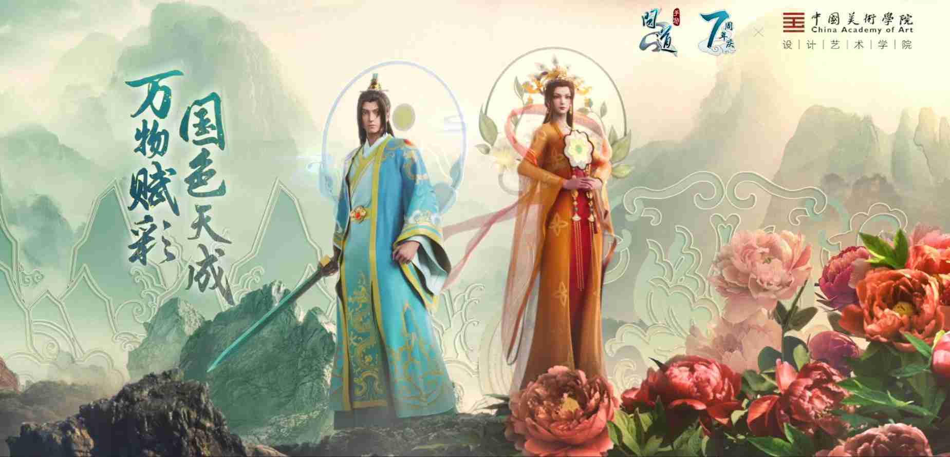 2023年4月,,,,《问道手游》联动中国美术学院,,,,在游戏中融合了中国历史上不同时期的文化元素,,,打造了“山河万象”与“凤鸣九霄”的国风时装。。在色彩配置方面,,创作团队基于对游戏角色特性的分析提取相应的文化内涵,,,,从每一种色彩的色相、、、指代事物和情感出发对应角色属性,,,,选定服装的色彩搭配。。在纹样设计方面,,,,创作团队结合游戏角色自身特殊的造型比例和形态,,,在实际的纹样设计中进行了游戏语境下的活化演绎。。男性角色集中使用了如蟒纹、、海水江崖纹、、、、如意纹和云气纹等传统纹样元素,,,女性角色则吸纳了凤凰纹、、、、牡丹纹、、、卷草缠枝纹等元素,,,,组成以“双凤牡丹纹样”“缠枝牡丹纹”“金玉凤冠头饰”为主要纹样的游戏角色装饰图案系统。。。。