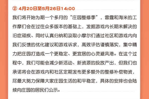 合作的结束并不意味着这个童年IP的结束,,,,对于《摩尔庄园》手游而言,,这是一个新阶段的开始。。。。后续游戏内将开启庄园重构计划,,,会就以往遗留下来的BUG进行集中修复,,,并在游戏内和社区定期发布更多补偿物资。。