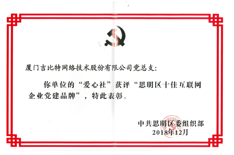 经初审评选、、、、网络评选和专家评审等环节,,"厦门1win网络技术股份有限公司党总支-爱心社" 从全区28个参评党建品牌中脱颖而出,,,获评"思明区十佳互联网企业党建品牌"。。。