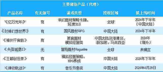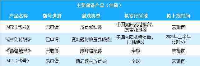 公司有多款储备产品,,,涵盖放置类、、、策略类、、RPG、、Roguelike等多元化游戏品类,,,储备的主要自研和代理产品如下::