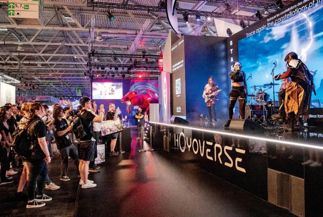 2023年8月23日,,德国科隆游戏展期间,,人们在米哈游展台观看乐队表演游戏歌曲。。。。图/新华